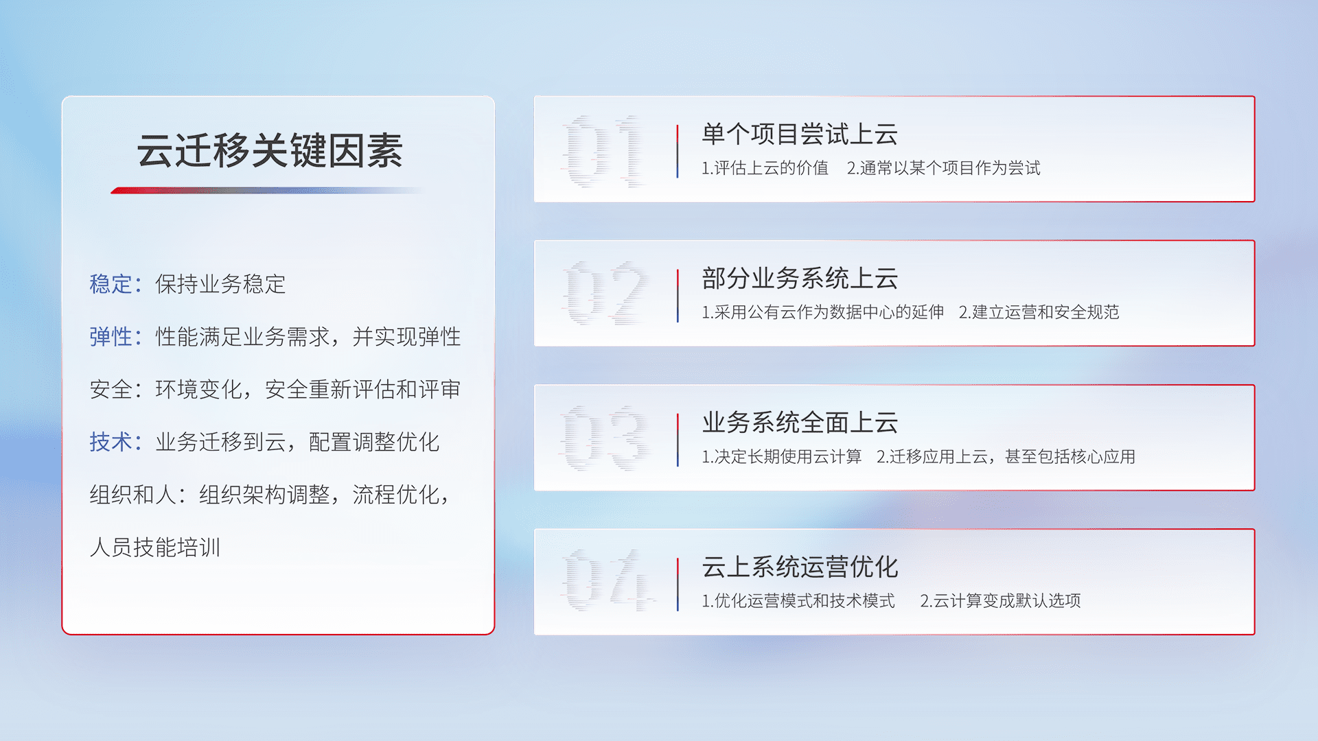 结合实际业务,,从规划设计、、云平台选型、、、云原生改造、、、、数据迁移、、、集成交付,,,迁移全过程为客户识别最佳上云路径,,,,做好风险识别管理,,,设计网络架构、、、、身份权限、、、安全审计合规、、、操作审计、、、、日志审计、、监控告警策略、、多站点容灾设计等,,,,对云上基础设施进行整体规划,,,提升IT治理水平,,以满足弹性、、高可用、、、、高性能的需求。。。