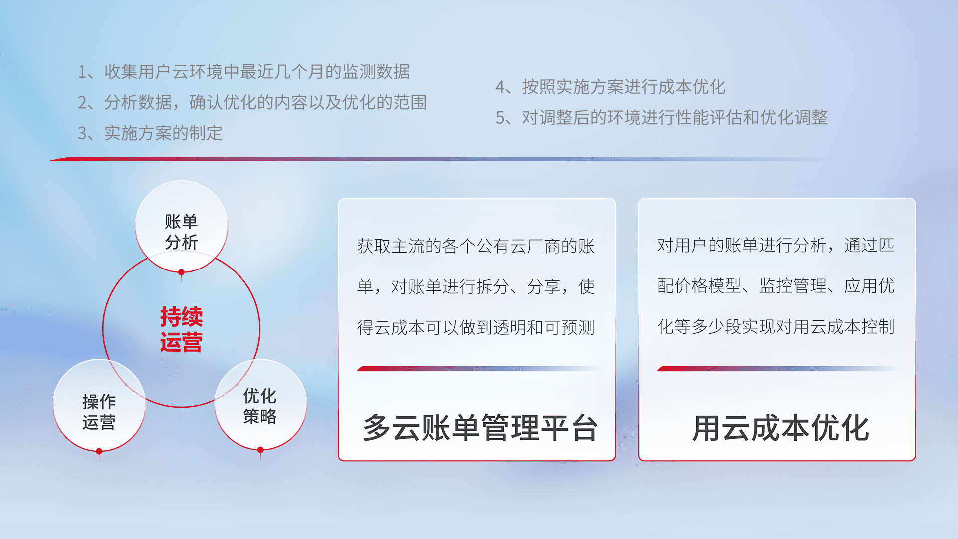 通过多云纳管,,,,以统一的资源数据模型把客户的云资源进行抽象和封装,,,进而实现对多云资源的统一操作,,,,保障云资源管理的可靠性、、、稳定性与可用性。。。量身定制化运维内容,,,配置、、、、开发运维、、、、补丁管理、、、备份、、、监控、、认证和访问管理、、审计和日常巡检等,,,保障在用云过程中的可靠度,,,稳定度以及高可用率。。。。