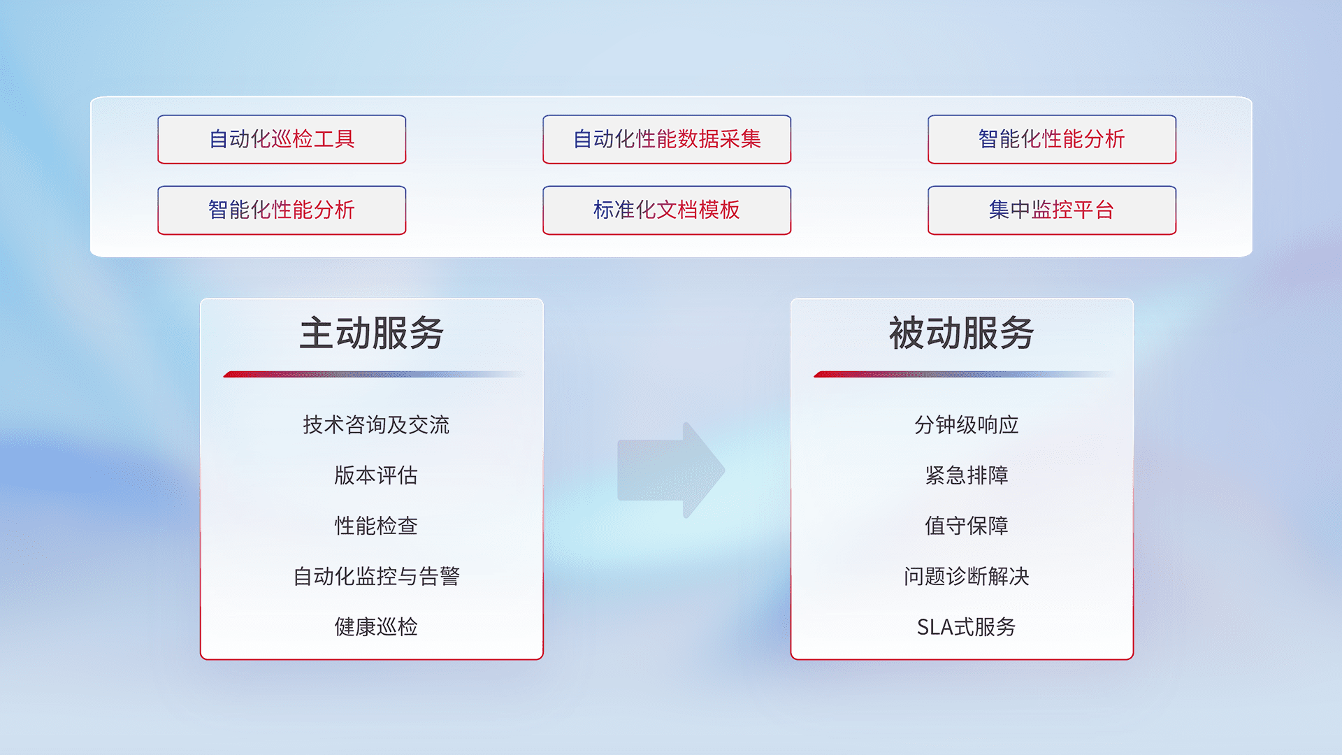 智能化工具和标准化文档,,保障服务质量,,,,提供主动服务(包含技术咨询、、版本评估、、、性能检查、、、、自动化监控与告警、、健康巡检)和被动服务包含(分钟级响应、、、、紧急排障、、、值守保障、、、问题诊断解决、、、、SLA服务)。。